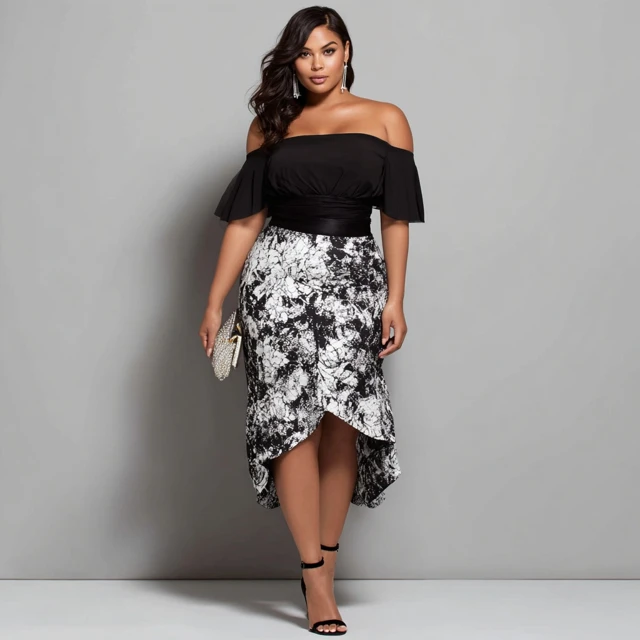 Why It Works: High-waist skirts define the waist, while an off-shoulder neckline adds flirty balance.