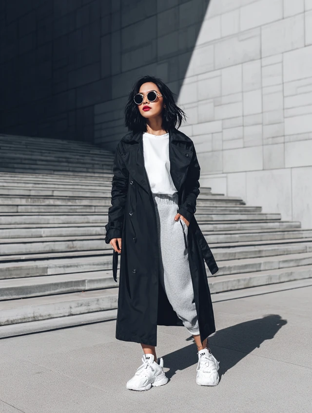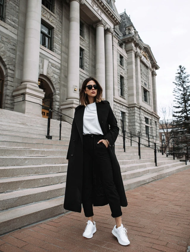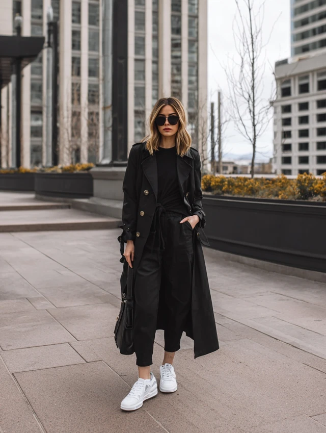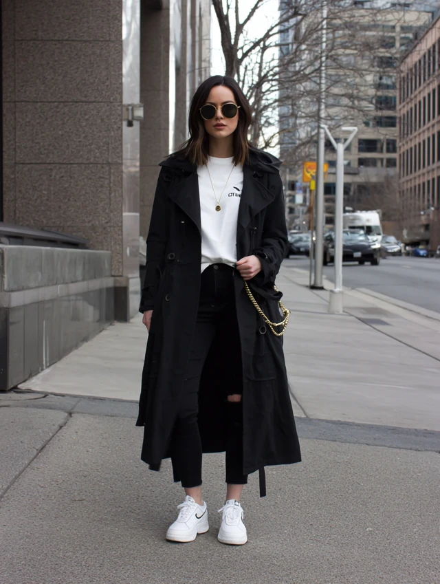 5. Black Trench Coat + White Sneakers + Oversized Tee