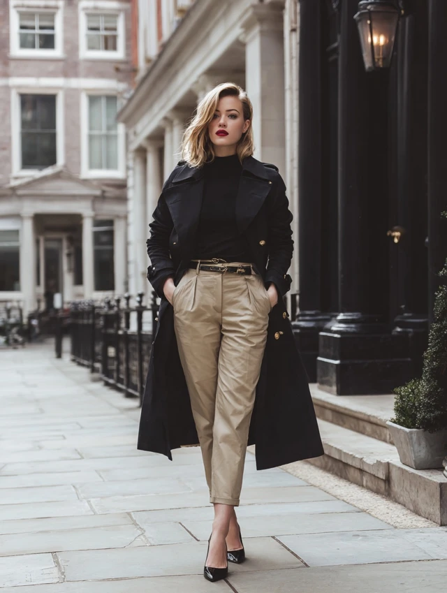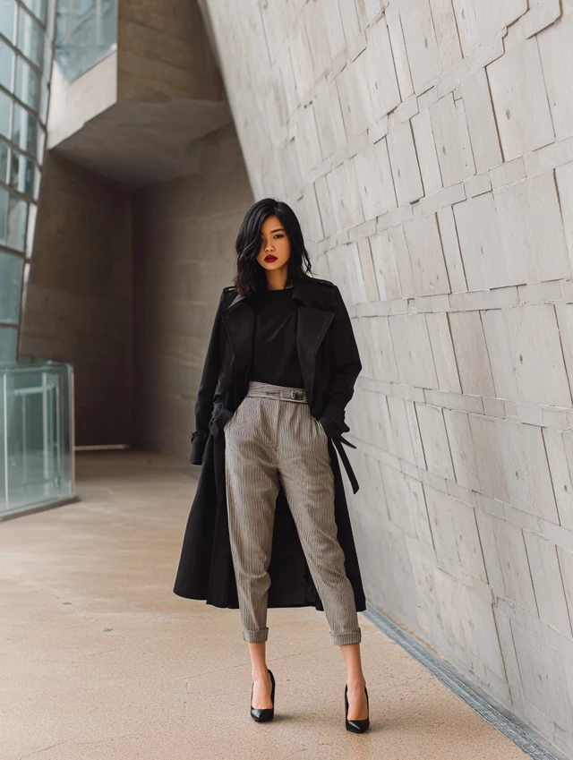 2. Black Trench Coat + Tailored Trousers + Pumps