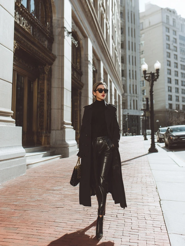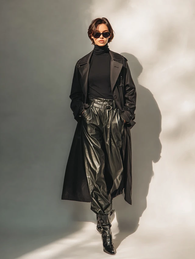 4. Black Trench Coat + Leather Pants + Turtleneck