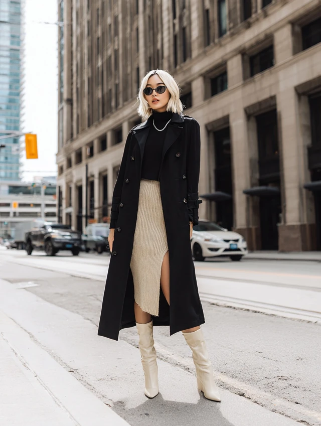 Styling a black trench coat is about building contrast and layering smartly: