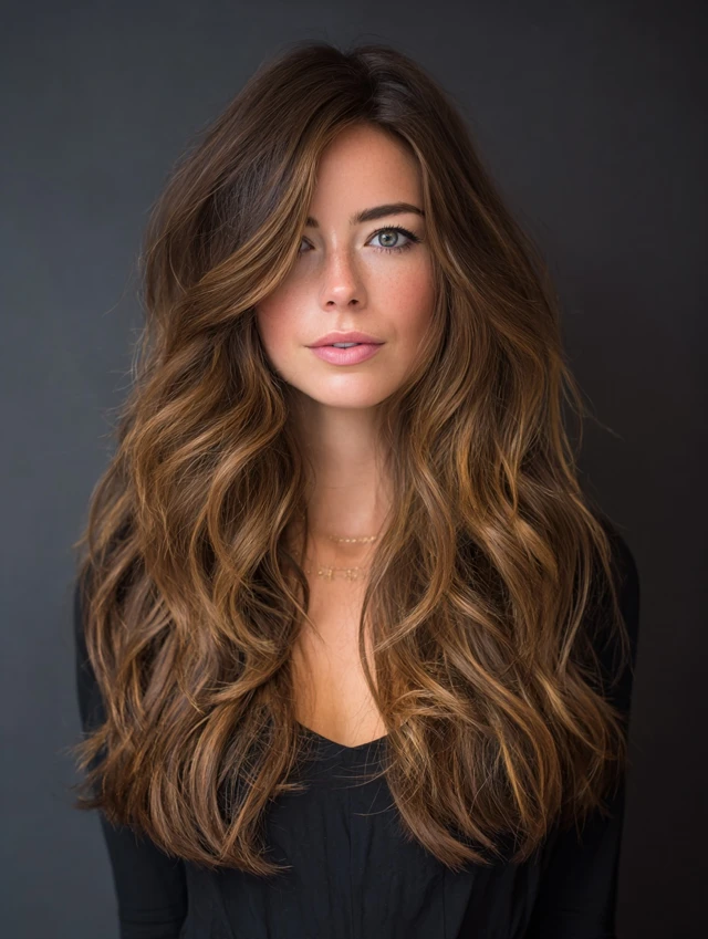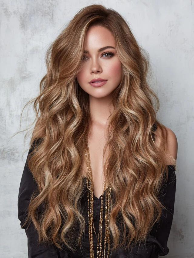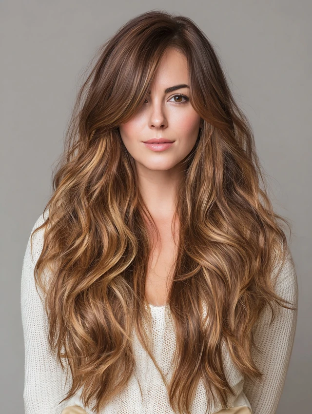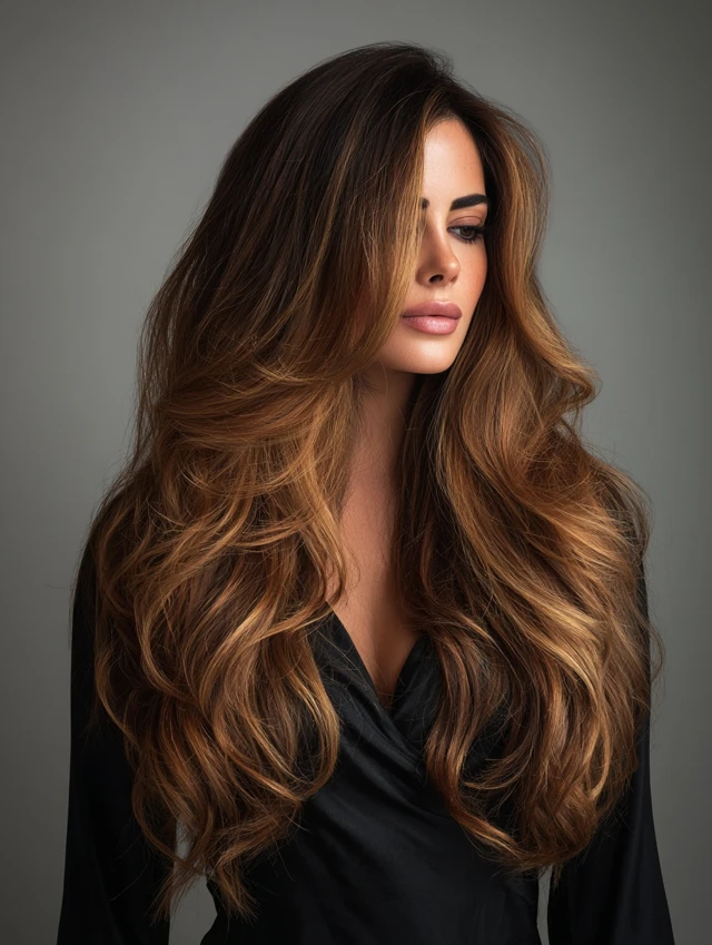 Long layers enhance the natural flow of waves, while caramel tones add dimension and shine.