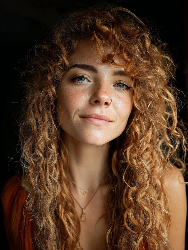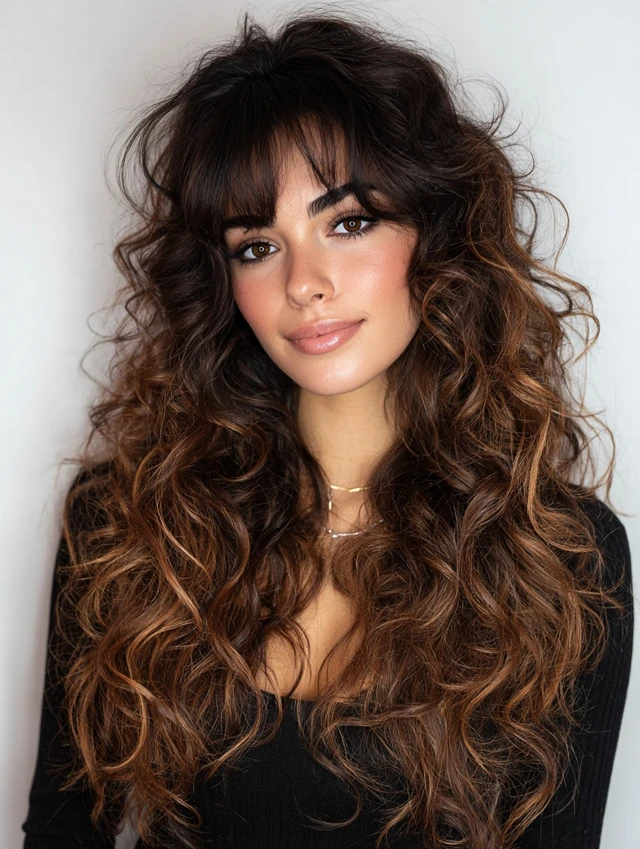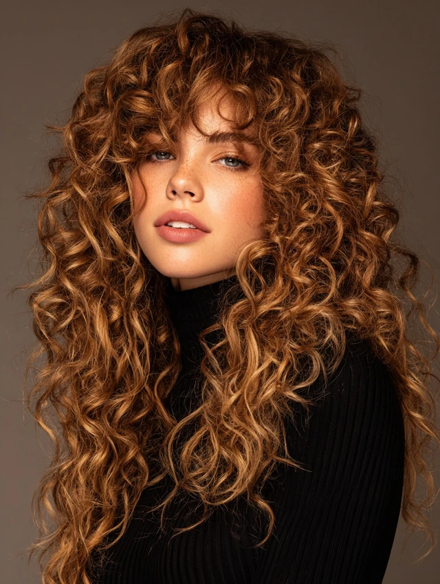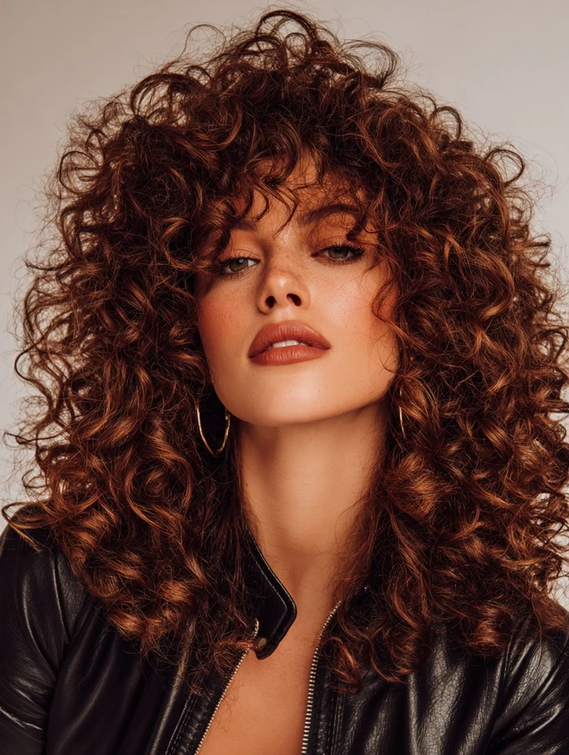 Layers prevent curls from looking heavy while enhancing volume and definition with caramel tones.