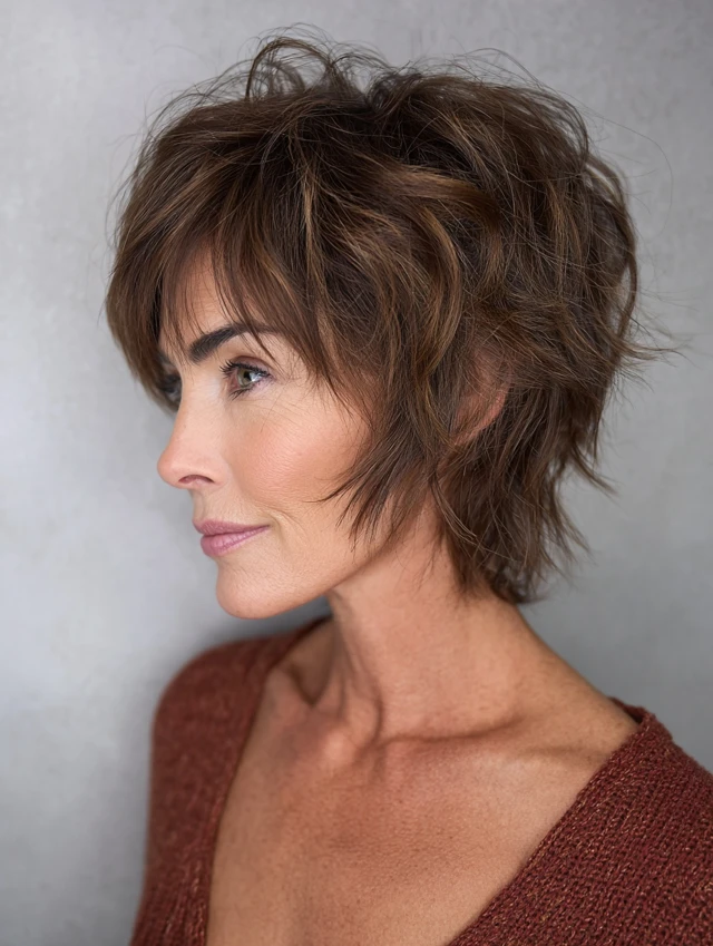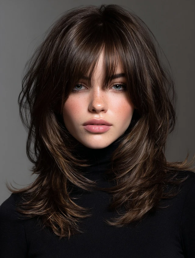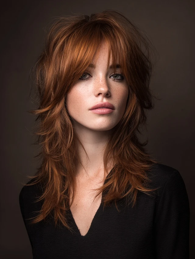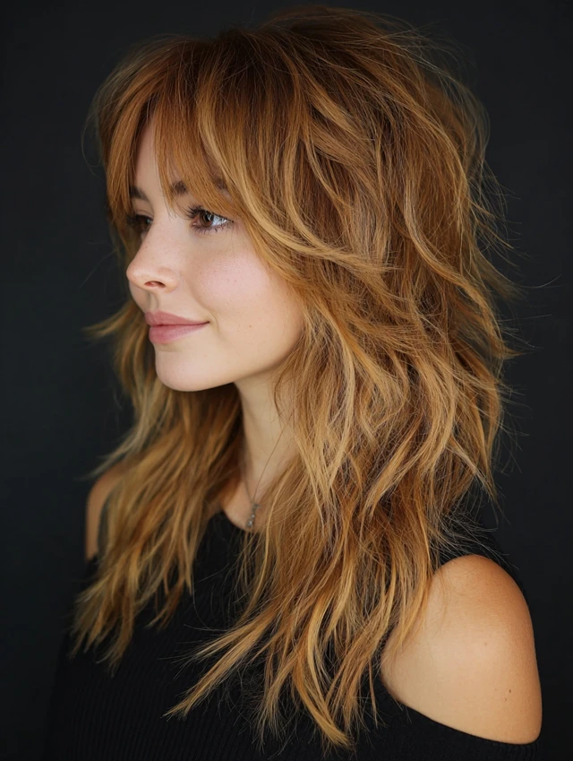 A shag cut adds edgy texture, while caramel tones soften the look with warmth.