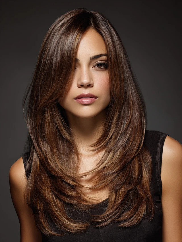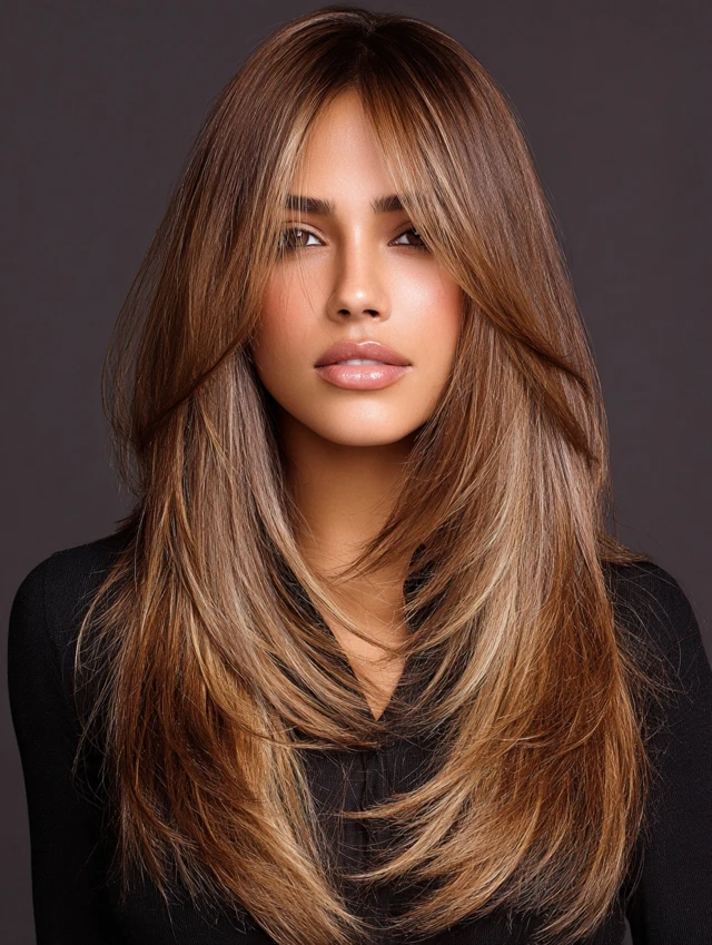 Feathered layers create movement in straight hair, while caramel tones add depth and shine.