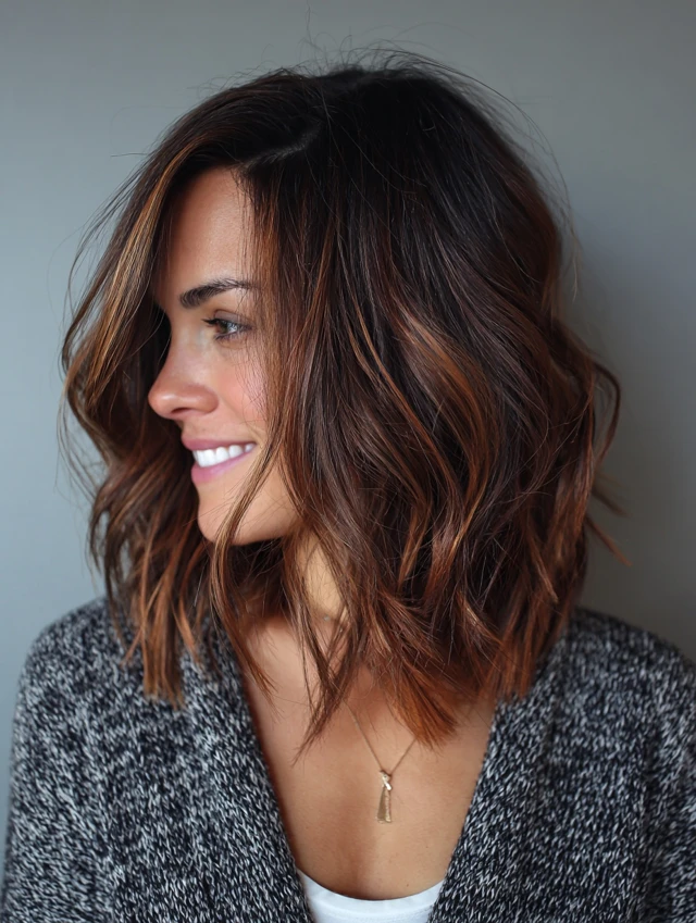 A long bob paired with caramel tones and strategic lowlights frames the face beautifully and adds structure.