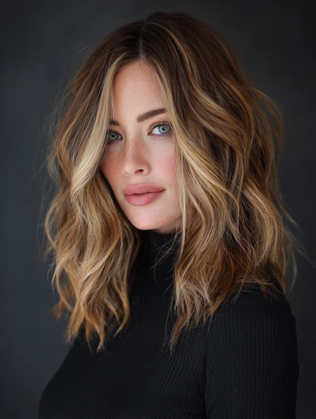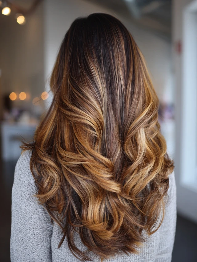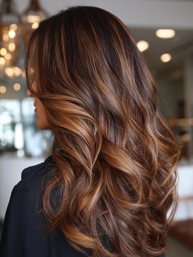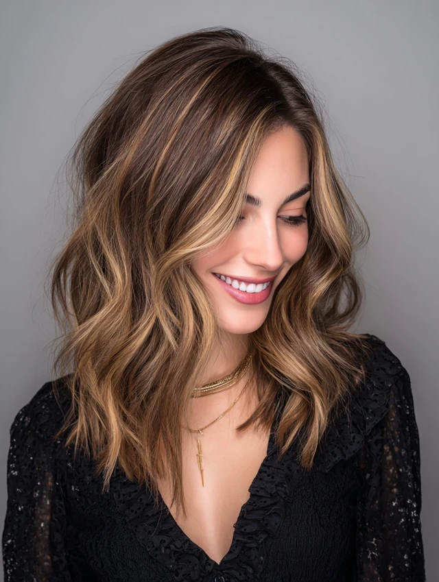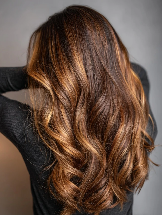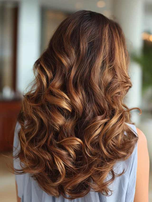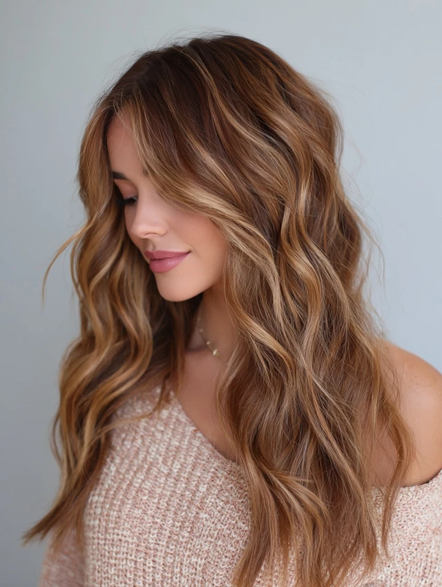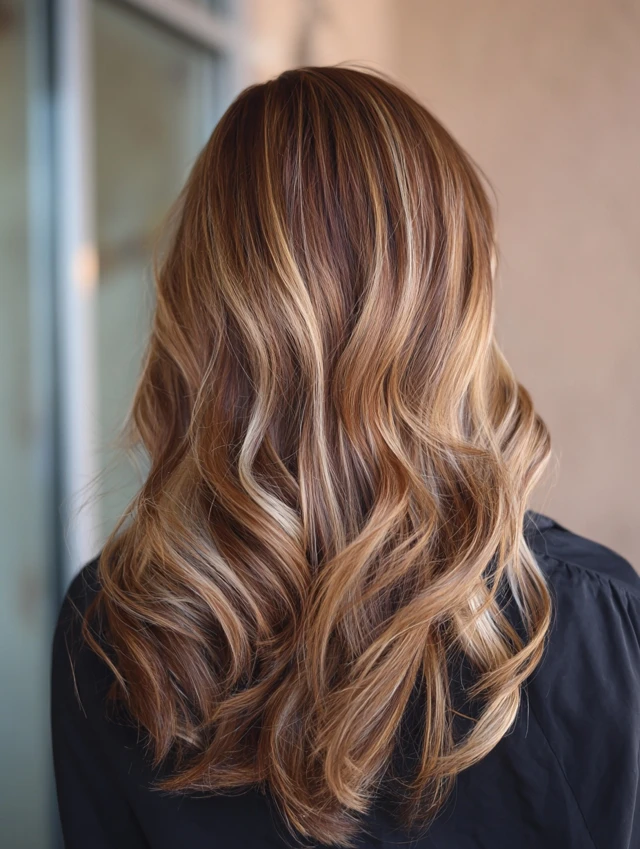 Soft waves enhance the contrast between caramel tones and lowlights, creating a natural sun-kissed effect with added depth.