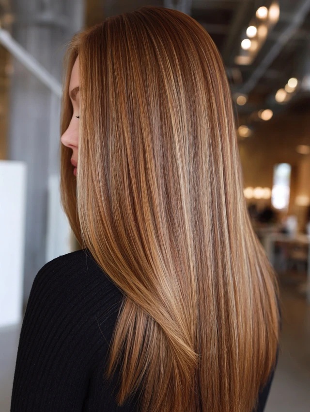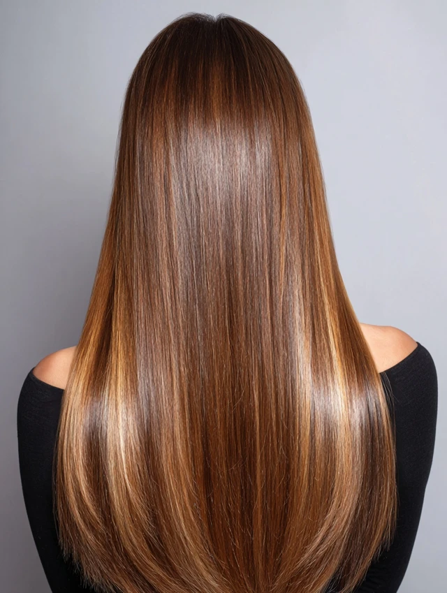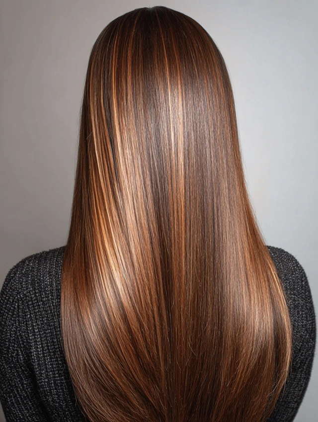 Straight hair showcases the color contrast clearly, highlighting the depth and shine of caramel tones and lowlights.