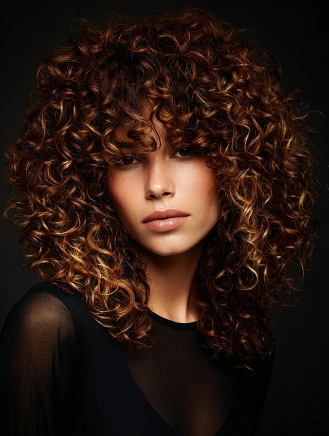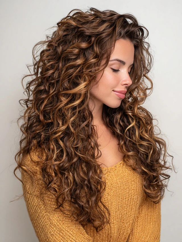 Curls naturally enhance color variation, making caramel tones and lowlights pop with depth and vibrancy.
