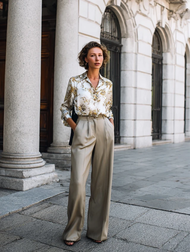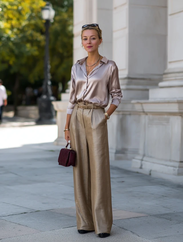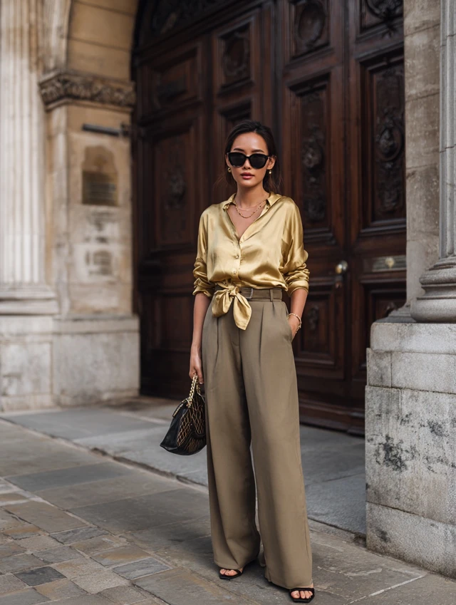 4. Wide-Leg Trousers + Silk Blouse