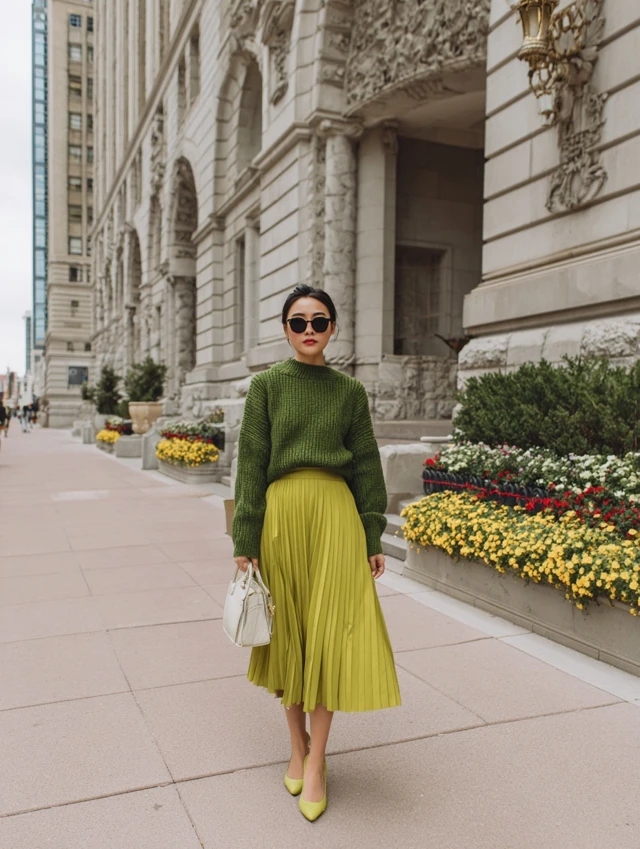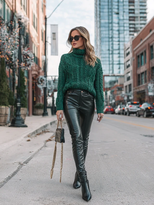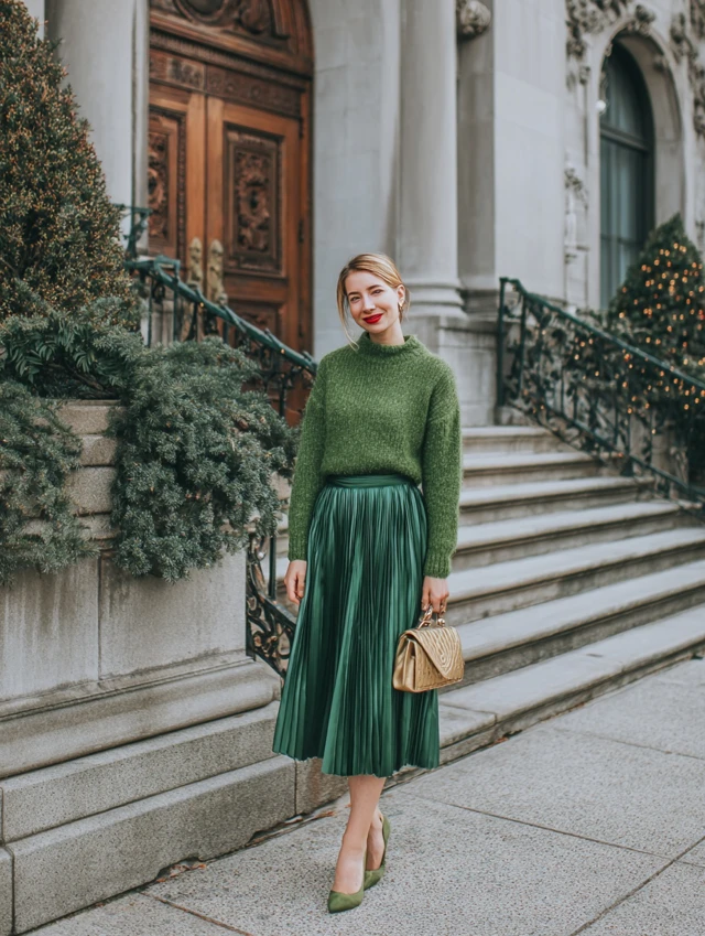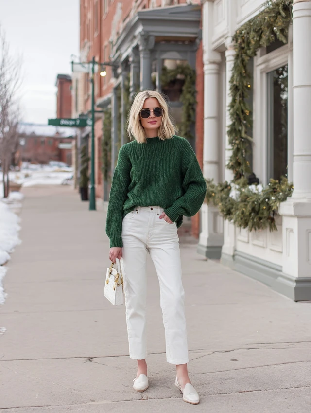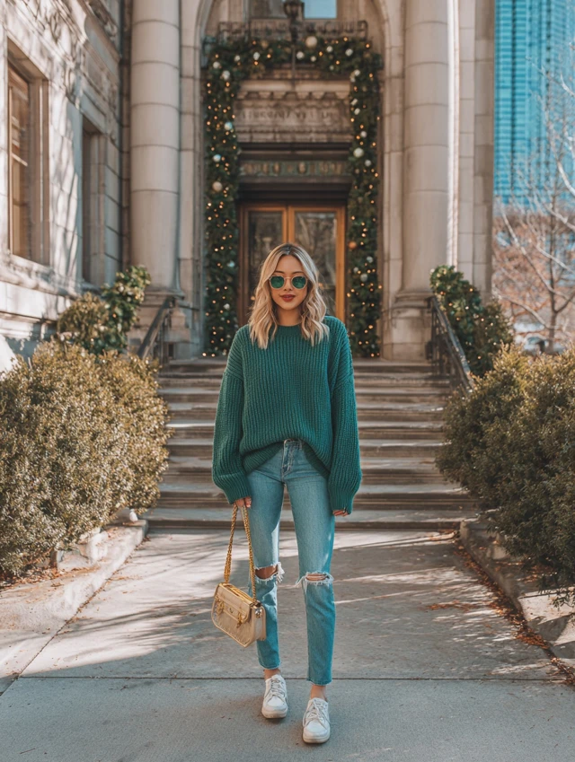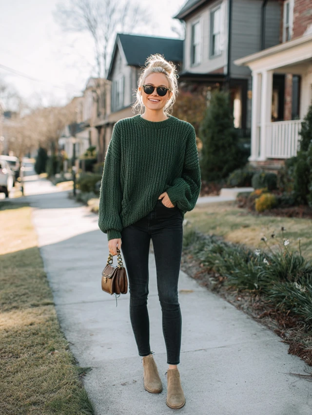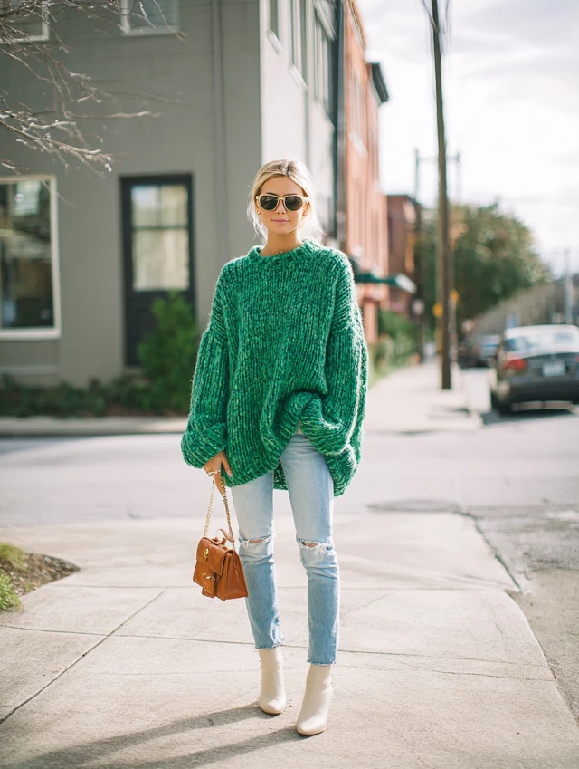 The green sweater is about comfort with flair. Keep your silhouette balanced, let the color shine, and accessorize with intention. Confidence will turn cozy into chic instantly.