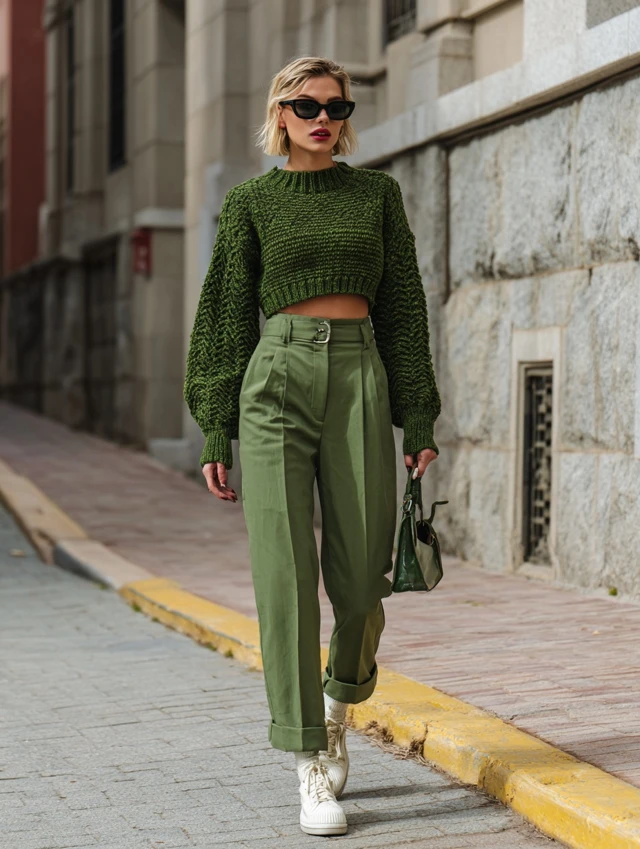 Green pairs beautifully with neutrals like beige, white, gray, and black, but also shines with denim and bold shades like burgundy or mustard. Knits create cozy vibes, cashmere adds luxury, and chunky textures bring playful edge.