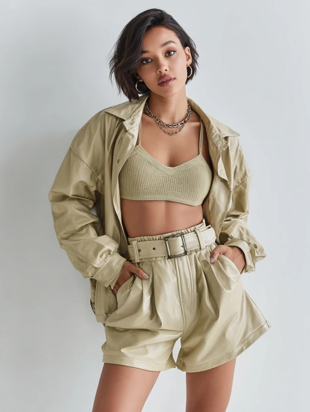 5. Leather Shorts + Crop Top + Oversized Jacket