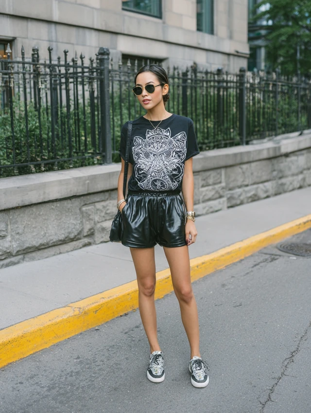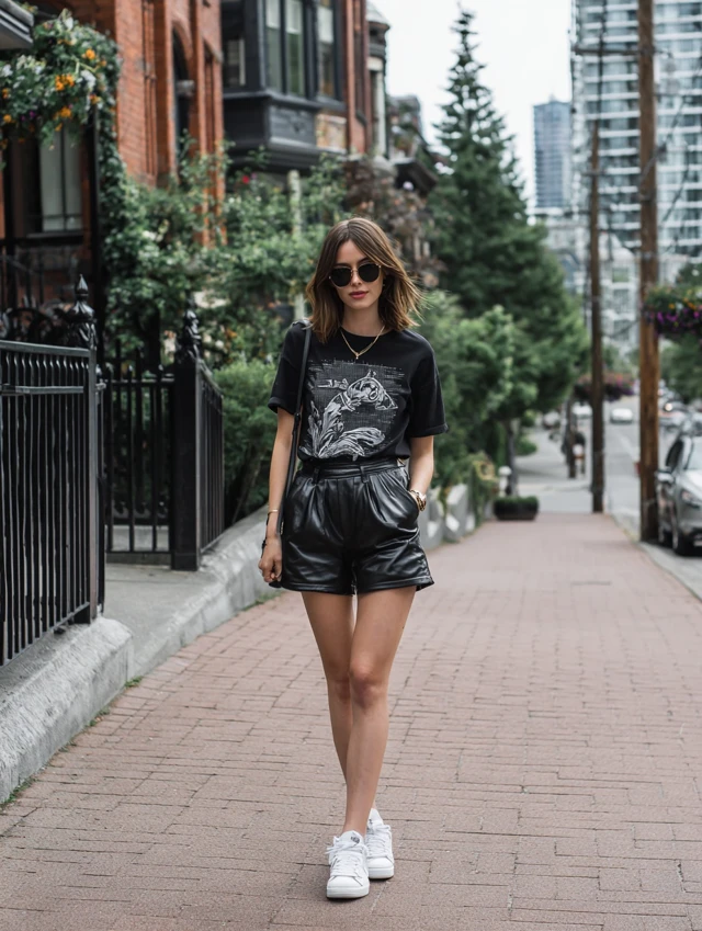 2. Black Leather Shorts + Graphic Tee + Sneakers
