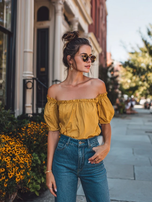• Tops: Fitted blouses, off-shoulder tops, peplums, or cropped jackets.