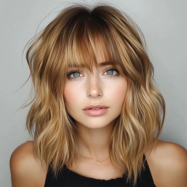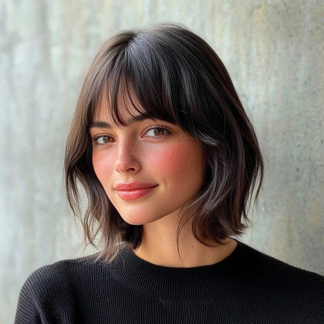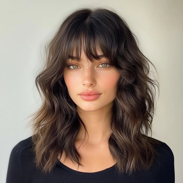 There’s a reason hairstylists love this combo. Shoulder-length hair provides enough length for styling variety without the heaviness of long locks, while bangs add character and frame your face beautifully.